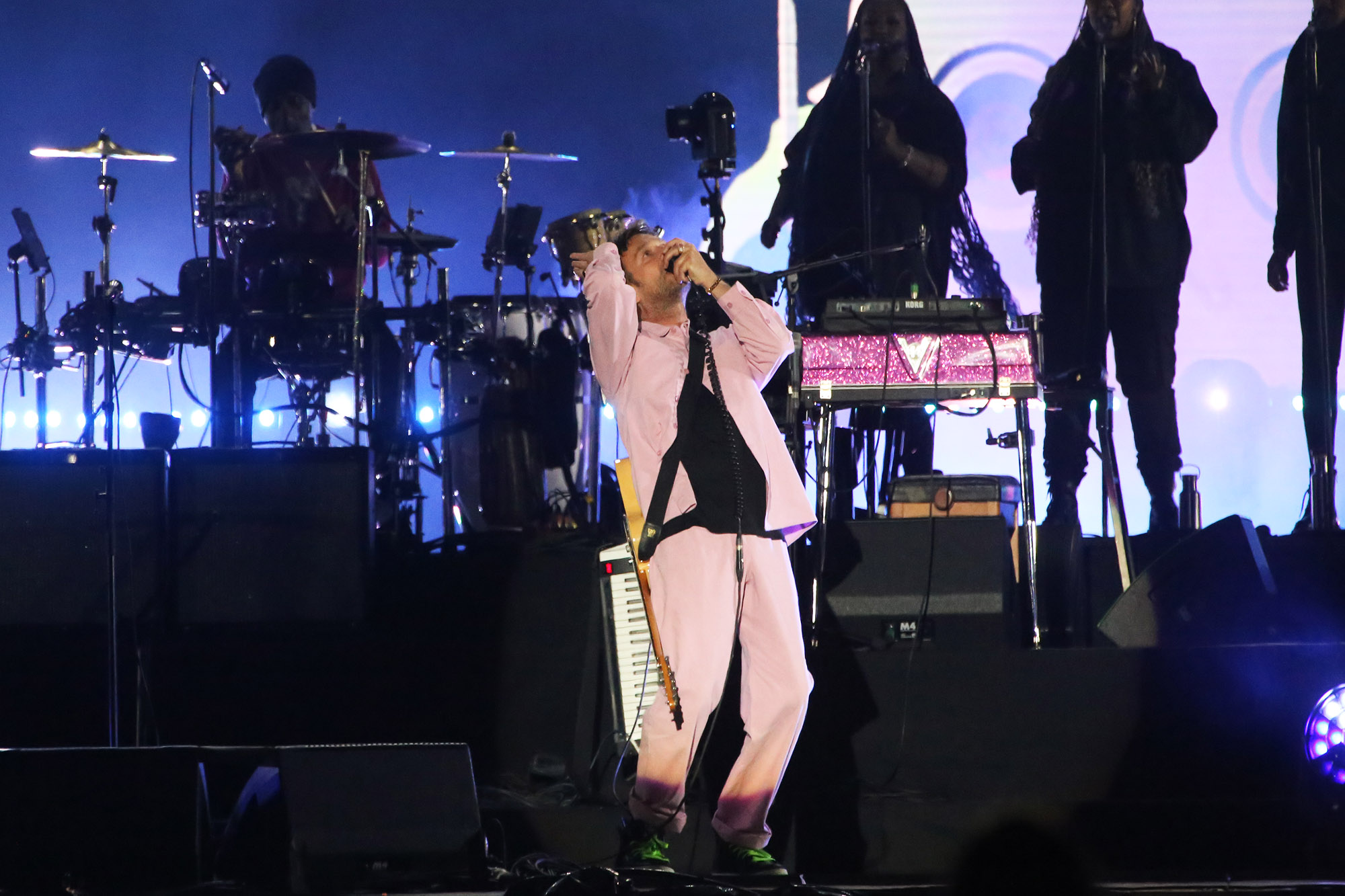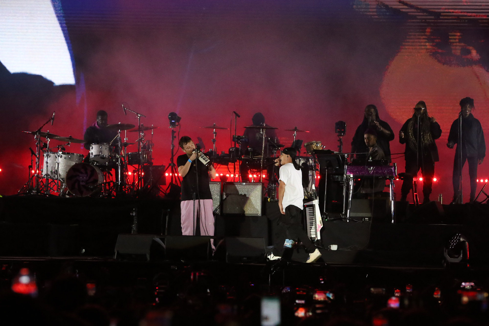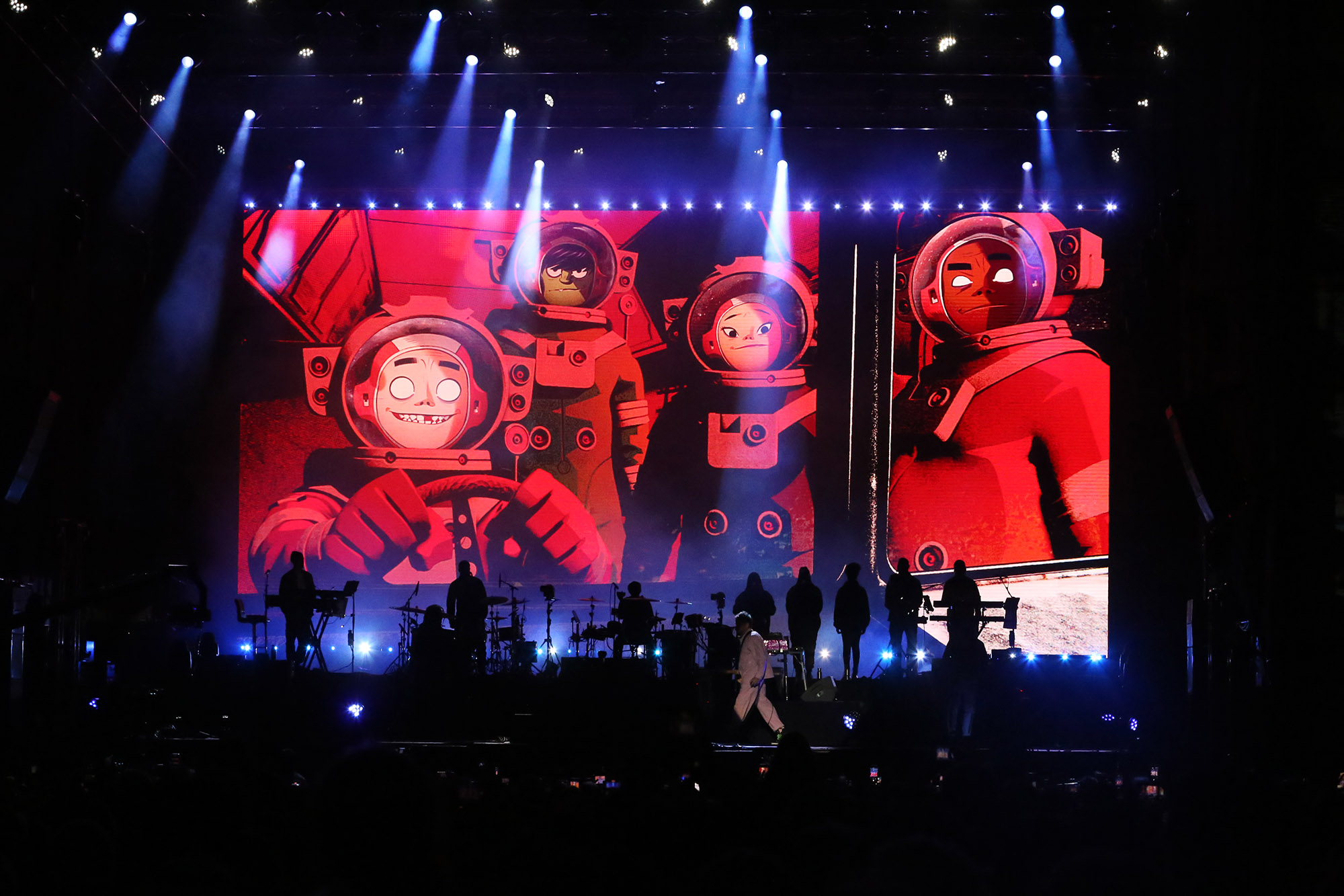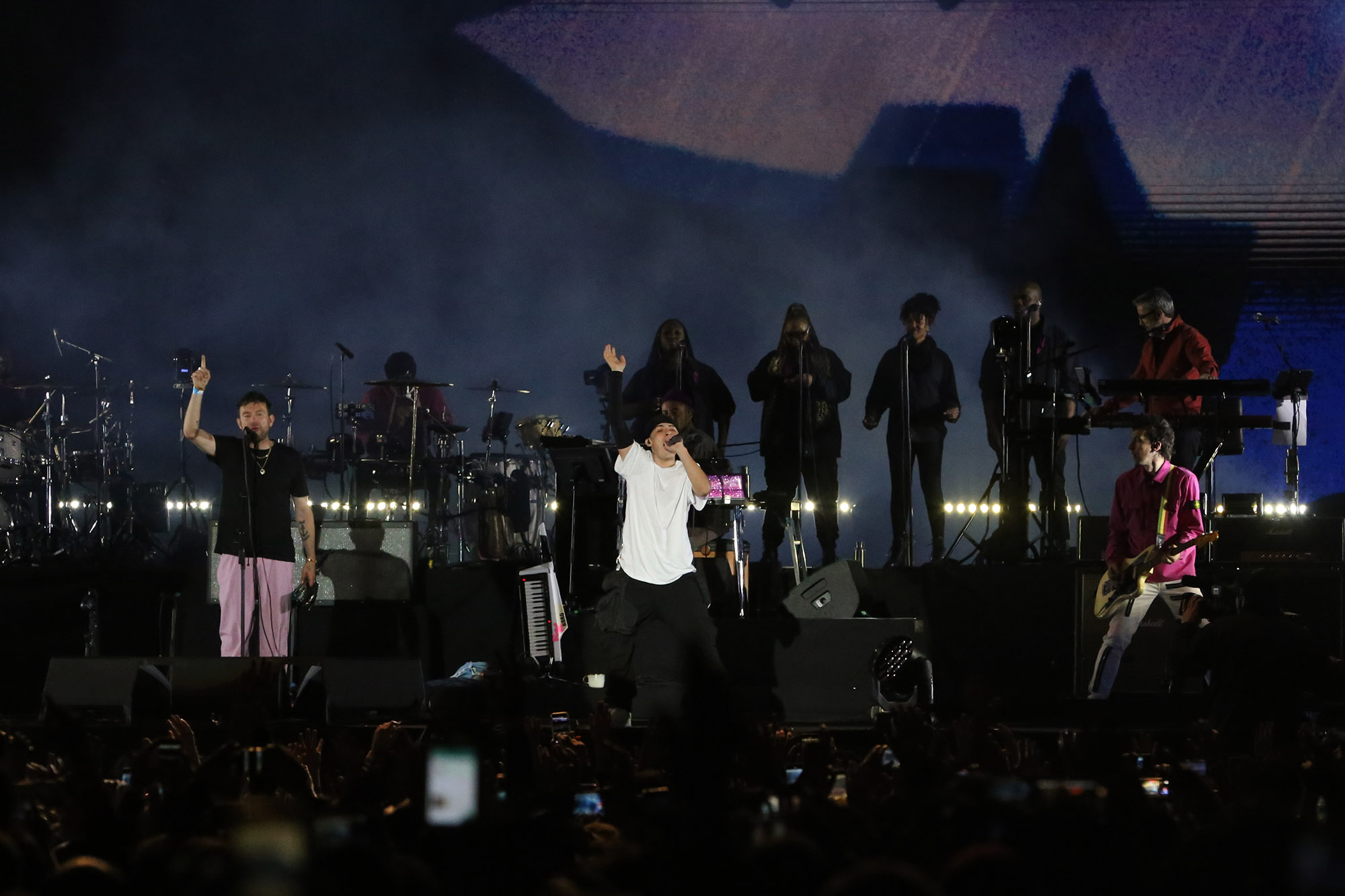 Si la animación y las canciones son las dos columnas centrales de Gorillaz, hay una que no debe ser desestimada y es la cuota escénica que le aporta Albarn. Para muestra, “Pirate Jet”, en la que volvió a bajar a la vallar, esta vez para ponerse una máscara de payaso igual a la que 2D utiliza en el video de Stylo, para luego sacarle el celular a alguien del público, filmarse en primer plano mientras cantaba y luego devolverlo, todo en poco más de un minuto. “On Melancholy Hill”, en cambio, lo tuvo de vuelta al piano para una de las canciones más conmovedoras de toda su cosecha. Desde ese mismo instrumento, el también líder de Blur dirigió los hilos del funk robótico de “Stylo”, que tuvo a Bootie Brown rapeando desde el escenario y a la voz grabada de Bobby Womack como una suerte de manifestación espectral en los estribillos.