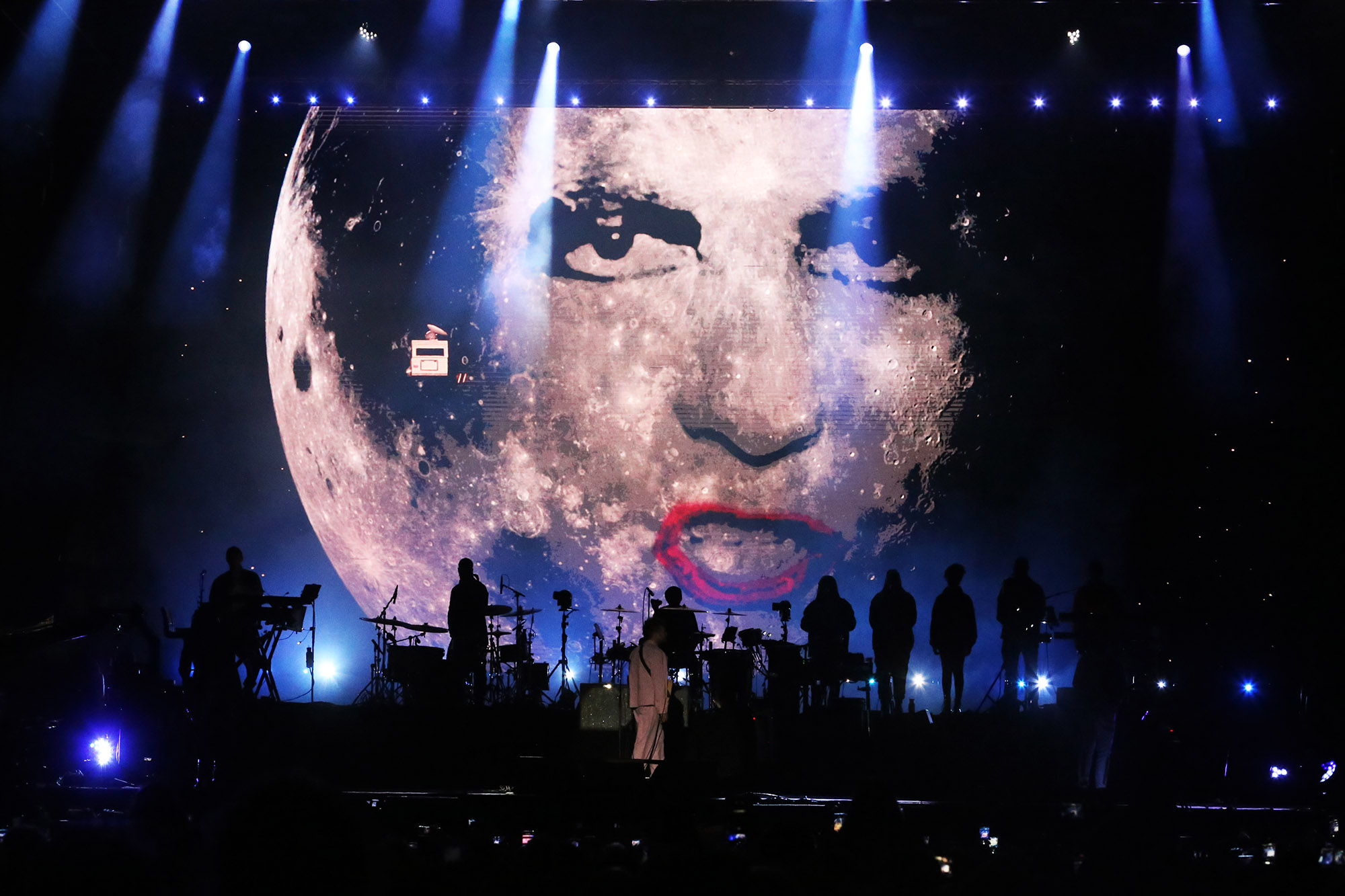 Y aunque las cosas terminaron bastante distintas, el comienzo de su segundo show en Buenos Aires fue bastante parecido al primero, con el crescendo punk de “M1 A1” y el dub juguetón de “Last Living Souls”. Para marcar una diferencia, entre ambas se posó “Strange Timez”, grabada junto a Robert Smith, y con la cara del líder de The Cure convertido en la luna de Georges Melies. “Tranz” fue uno de los varios momentos en los que la música pareció sintonizar con el apocalipsis, y después “Aries” pegó un giro: un cimbronazo distorsionado que prometía caos le abrió paso a un electropop corte Manchester, con el bajista Seye Adelekan replicando nota por nota la línea que Peter Hook grabó en su versión original.
