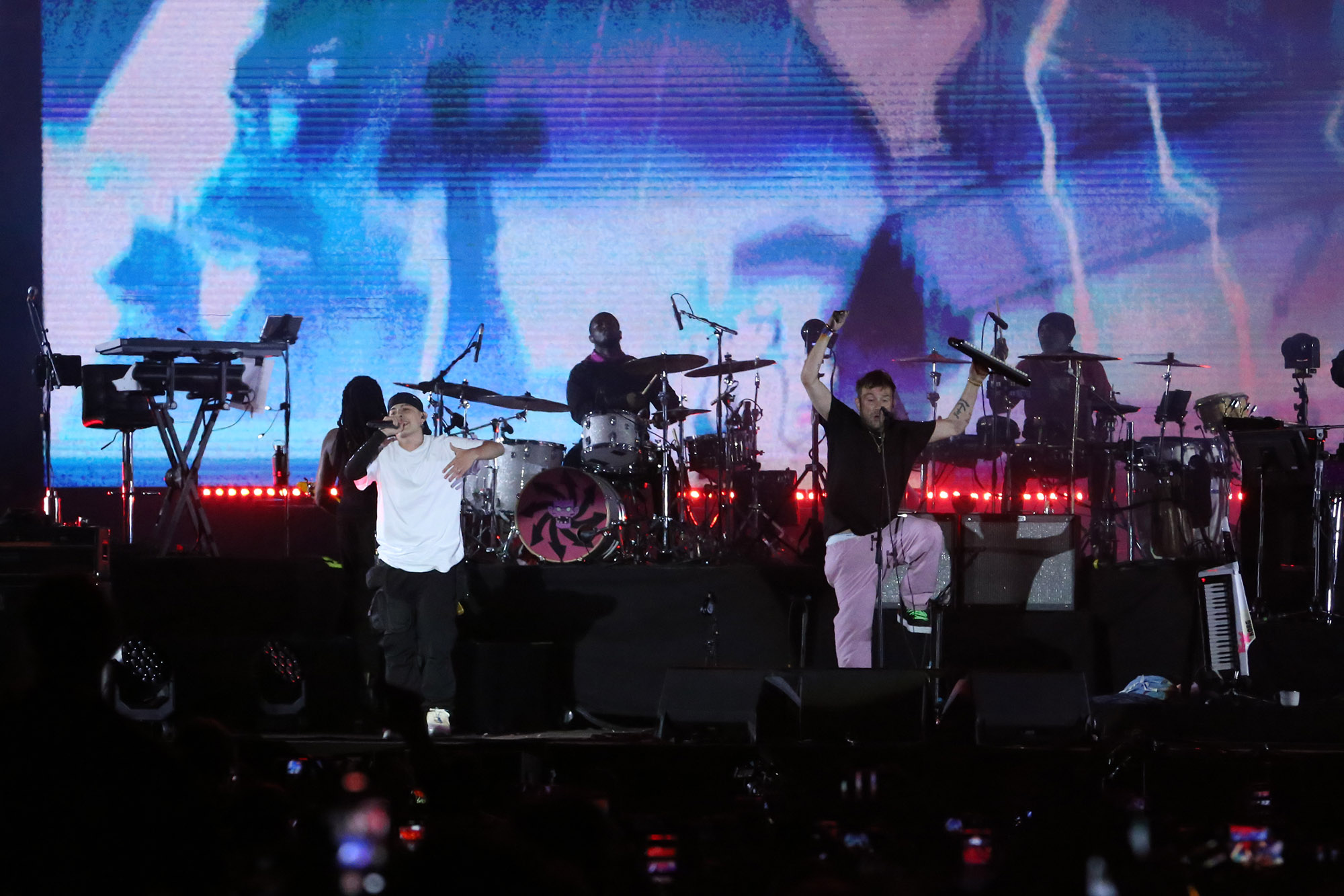 La segunda visita de Gorillaz a la Argentina quedará marcada por un feat no tan inesperado que ocurrió en el último tema del concierto. Minutos antes del final, después de una hora y media de un show que se meció entre hits, deep cuts y algún que otro estreno, Damon Albarn invitó a Trueno a compartir el escenario en “Clint Eastwood”. El freestyler de La Boca entró al escenario del Quilmes Rock sin anuncio para tirar barras en el que tal vez sea el hit máximo de Gorillaz, mientras el dueño del circo animado lo miraba con una media sonrisa en su boca, como aprobando el filo de cada verso por más que no pudiera entender una sola palabra de lo que estaba escuchando. Si en su show en Uruguay, Albarn había querido tener un gesto con el público al tocar “The Tower of Montevideo”, acá las cosas habían ido bastante más al límite.