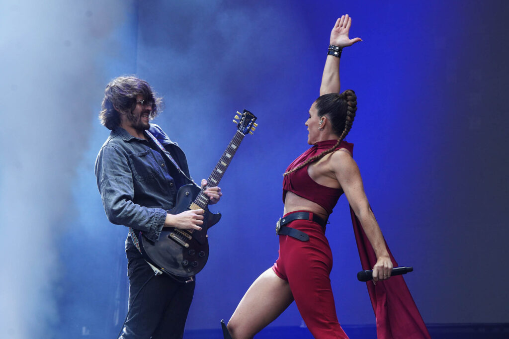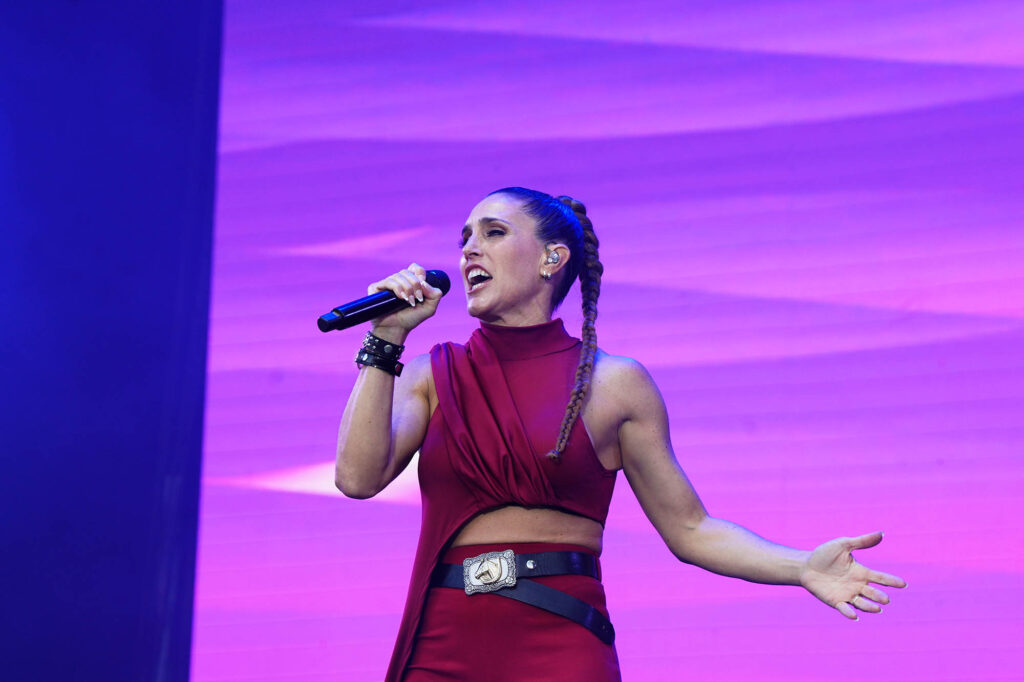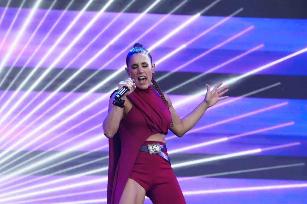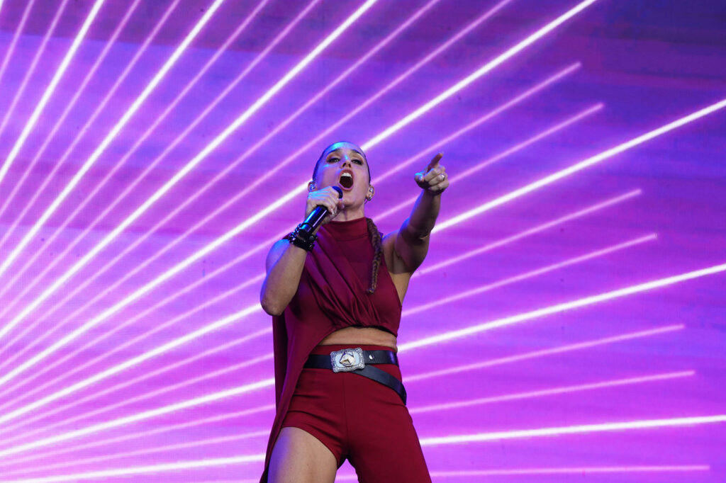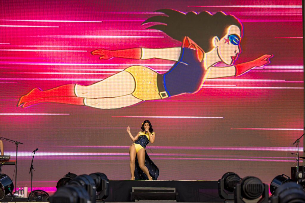 Princesa del poder. Así se percibe desde el nombre de su último disco Marina (sin diamantes ya en su nombre artístico), el que la trajo por tercera vez a Argentina. Su catsuit de amarillo intenso era deudor del de Madonna en la época de Confessions on a Dance Floor, de ahí que el medley entre su propio “Metallic Stallion” y el “Hung Up” de la Reina del Pop sonaran como una continuación lógica. En el otro extremo del predio, Ángela Torres pareció haber tomado nota de sus enseñanzas para darle forma a un show edificado sobre su álbum debut, No me olvides. Con su pasado de niña estrella a cuestas, su set parecía hecho a medida de las romcoms que se veían en pantalla durante “Vértigo”, y los gestos aparecieron de a poco. Primero llegó la versión de “Una luna de miel en la mano”, de Virus; después fue el turno del homenaje a su abuela con “La niña de fuego” en plan cantaora para la generación Tik Tok junto a Kastiello. Y ahí, sin preámbulos, Torres recordó la inminente llegada del 50 aniversario del Golpe de Estado, que cerró con un pedido de memoria, verdad y justicia y una interpretación de “Como la cigarra”, de Maria Elena Walsh en un formato de arpa, glockenspiel y cuerdas con el que también versionó a Valeria Lynch con “Qué ganas de no verte nunca más”. ¿Más muestras de su versatilidad? Una rendición bastante fiel de “Girls Just Want to Have Fun” casi pegada a la cumbia XXL de “Sinvergüenza”, todas señales de su crecimiento.