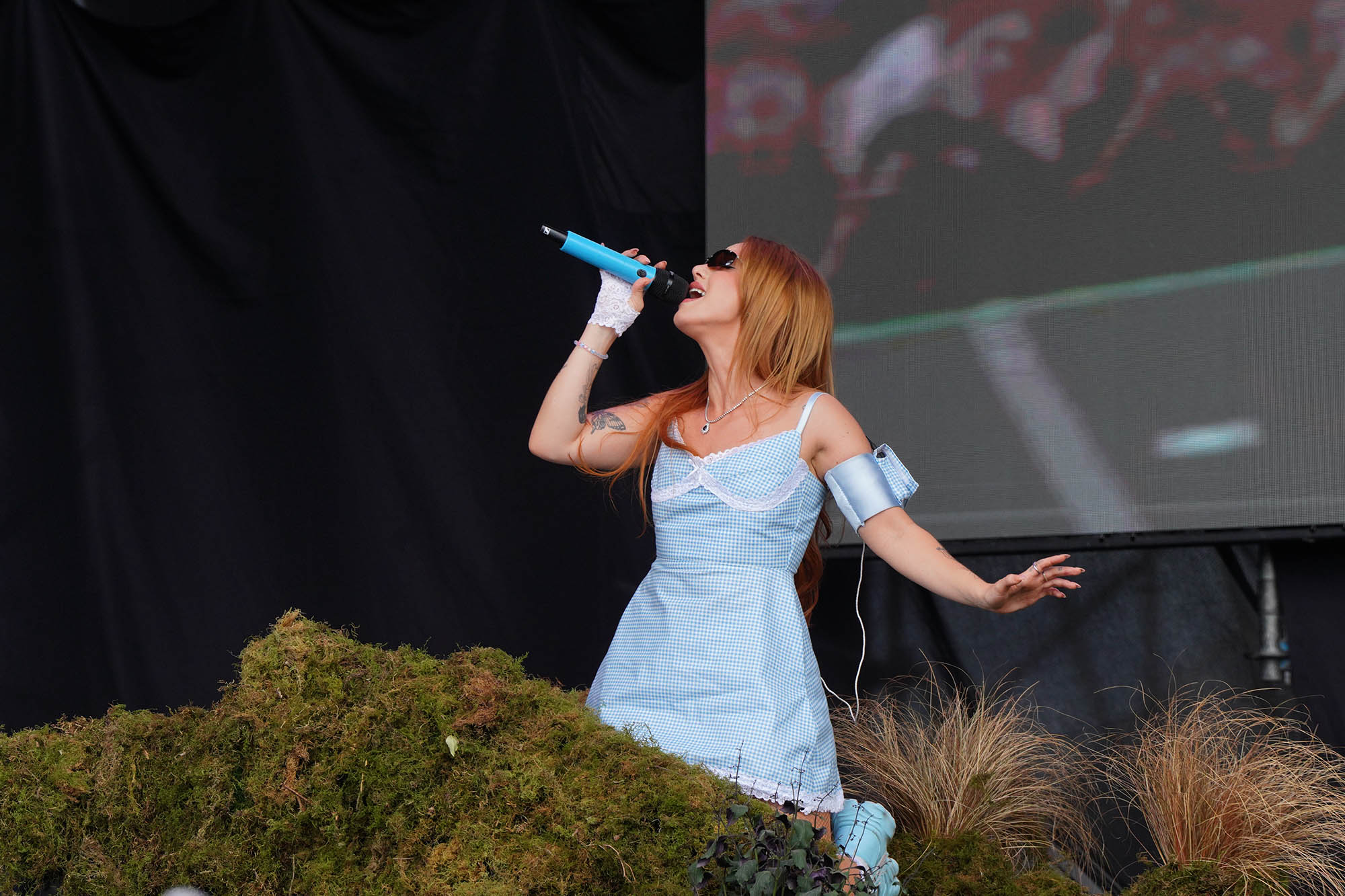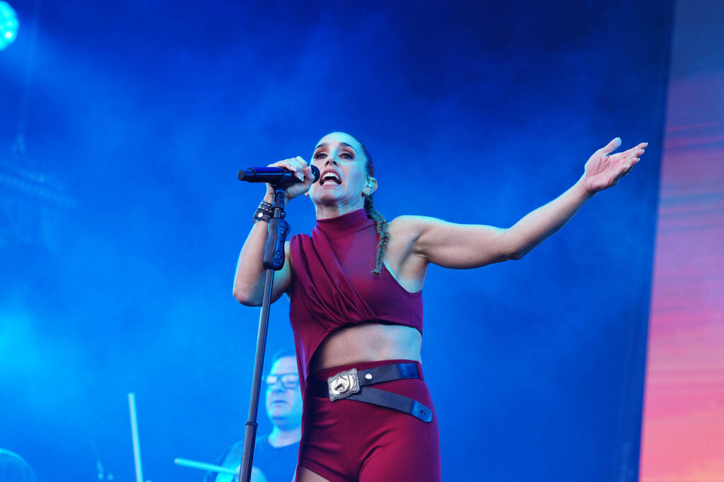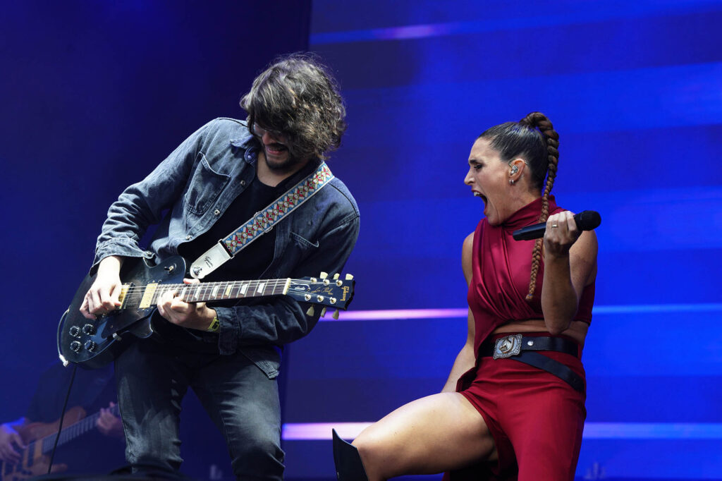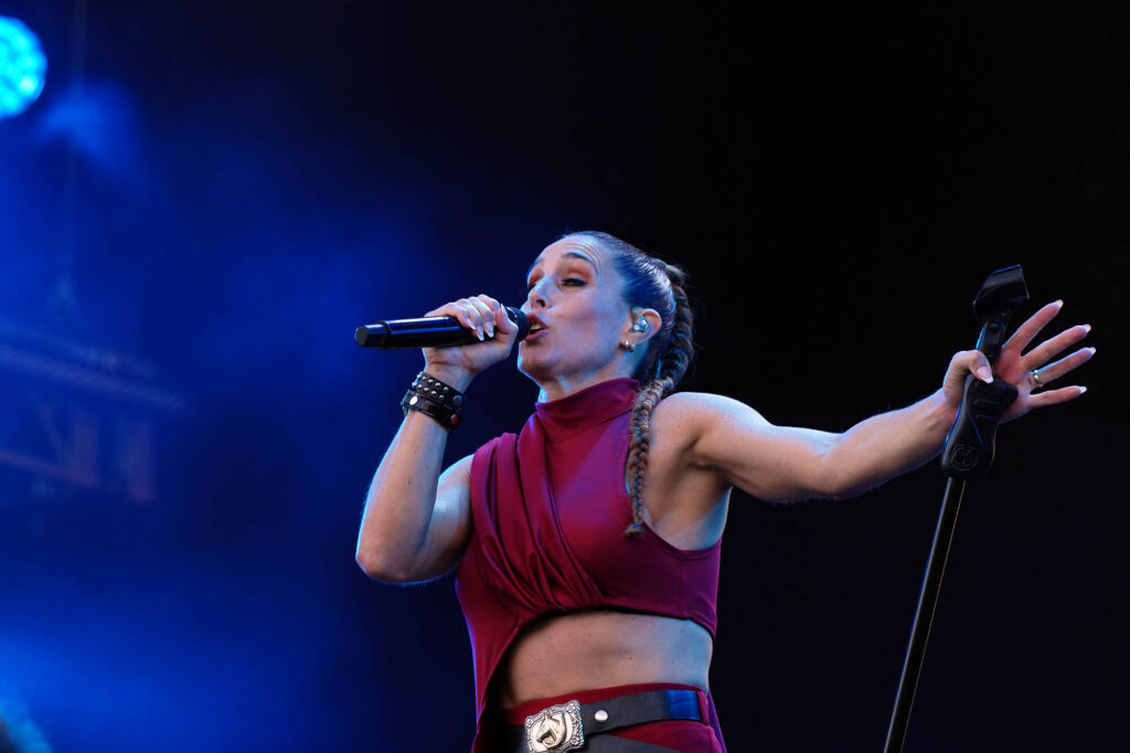 Princesa del poder. Así se percibe desde el nombre de su último disco Marina (sin diamantes ya en su nombre artístico), el que la trajo por tercera vez a Argentina. Su catsuit de amarillo intenso era deudor del de Madonna en la época de Confessions on a Dance Floor, de ahí que el medley entre su propio “Metallic Stallion” y el “Hung Up” de la Reina del Pop sonaran como una continuación lógica. En el otro extremo del predio, Ángela Torres pareció haber tomado nota de sus enseñanzas para darle forma a un show edificado sobre su álbum debut, No me olvides. Con su pasado de niña estrella a cuestas, su set parecía hecho a medida de las romcoms que se veían en pantalla durante “Vértigo”, y los gestos aparecieron de a poco. Primero llegó la versión de “Una luna de miel en la mano”, de Virus; después fue el turno del homenaje a su abuela con “La niña de fuego” en plan cantaora para la generación Tik Tok junto a Kastiello. Y ahí, sin preámbulos, Torres recordó la inminente llegada del 50 aniversario del Golpe de Estado, que cerró con un pedido de memoria, verdad y justicia y una interpretación de “Como la cigarra”, de Maria Elena Walsh en un formato de arpa, glockenspiel y cuerdas con el que también versionó a Valeria Lynch con “Qué ganas de no verte nunca más”. ¿Más muestras de su versatilidad? Una rendición bastante fiel de “Girls Just Want to Have Fun” casi pegada a la cumbia XXL de “Sinvergüenza”, todas señales de su crecimiento.